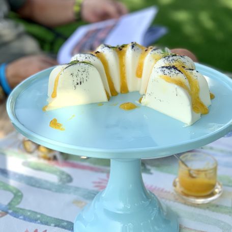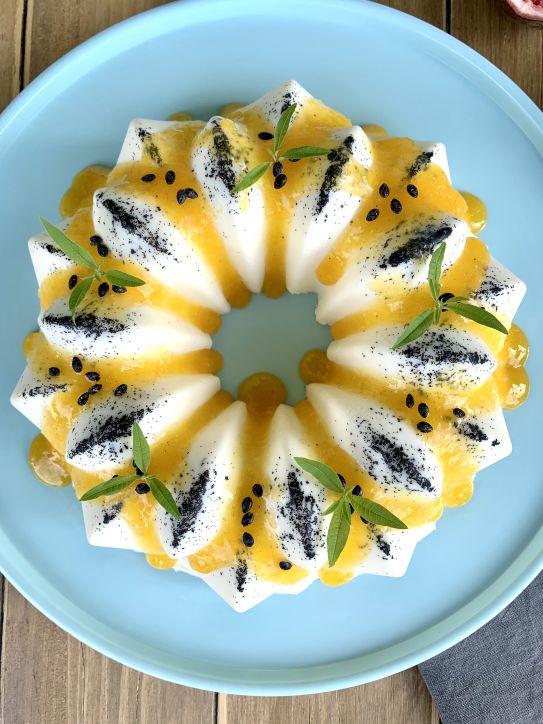 Prendi la panna cotta e versaci sopra la salsa al frutto della passione quando sarà tiepida.