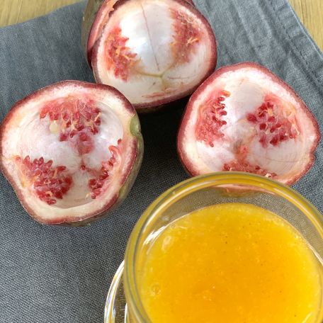 Per preparare la salsa al frutto della passione taglia a metà i frutti e togli la polpa con i semi, trasferendoli direttamente in un mixer per frullarli ed ottenere il succo. Con un colino filtra i semi e recupera tutto il succo. Con 8 frutti dovresti ricavare almeno 100 ml di liquido.