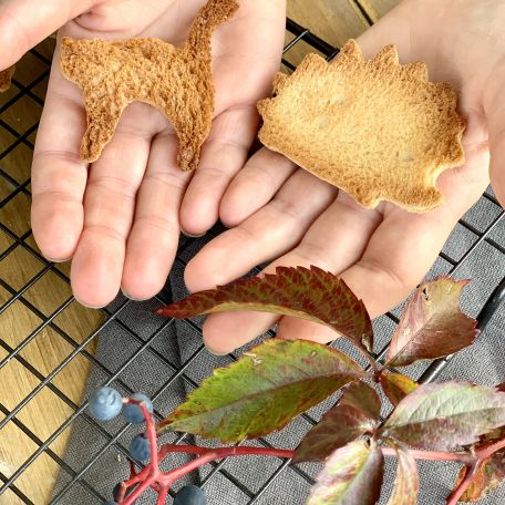Sistema queste 4 fette intagliate e le 4 sagome degli animali sulla teglia da forno insieme alle altre.