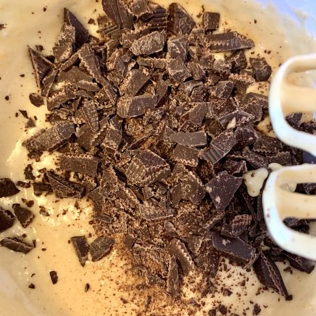 Aggiungi poi il cioccolato tritato grossolanamente con un coltello VEDI FOTO (tieni da parte un pò di cioccolato per guarnire i muffin).