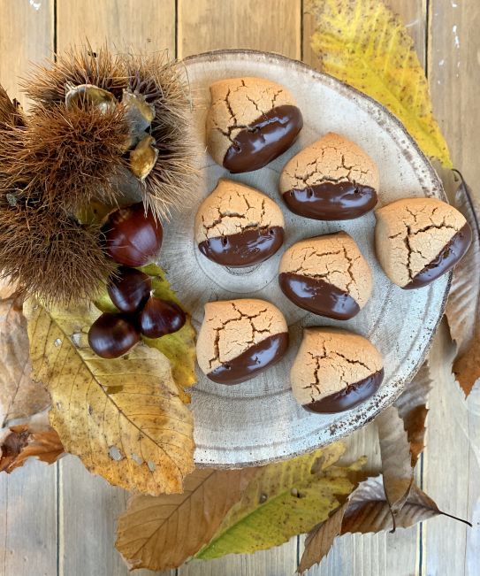 Sciogli il cioccolato a bagnomaria e intingi ogni castagnotto in modo da formare la classica lunetta del frutto VEDI FOTO