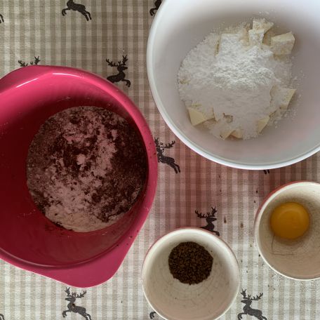 In una ciotola metti la farina, la fecola e il cacao amaro in polvere (ricordati di setacciare bene tutte le polveri) VEDI FOTO