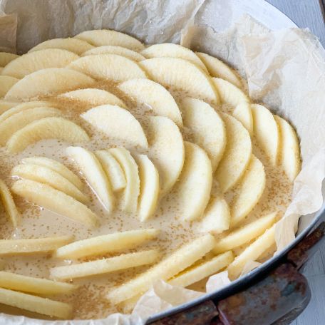Sbuccia le mele, togli il torsolo e tagliale a fettine per posizionarle a cerchio sull'impasto VEDI FOTO