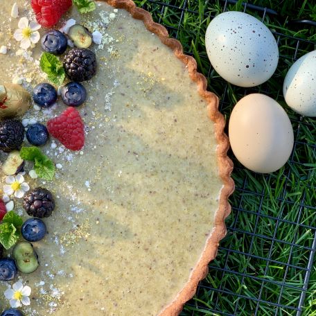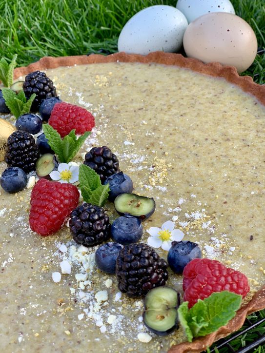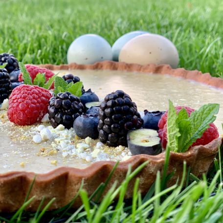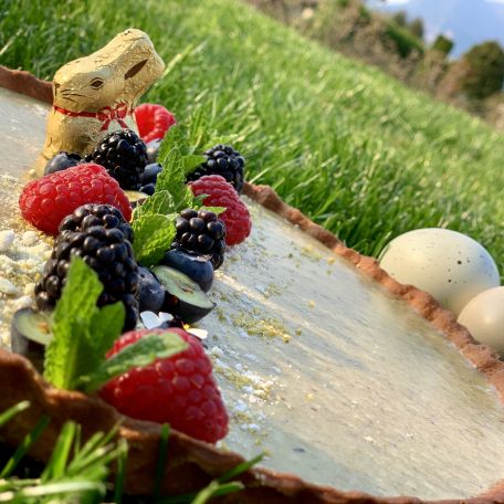 Come decori io ho utilizzato: frutti di bosco, meringhe sbriciolate, fiori di fragoline di bosco, farina di pistacchi, foglioline di menta e un coniglietto Gold Bunny di Lindt