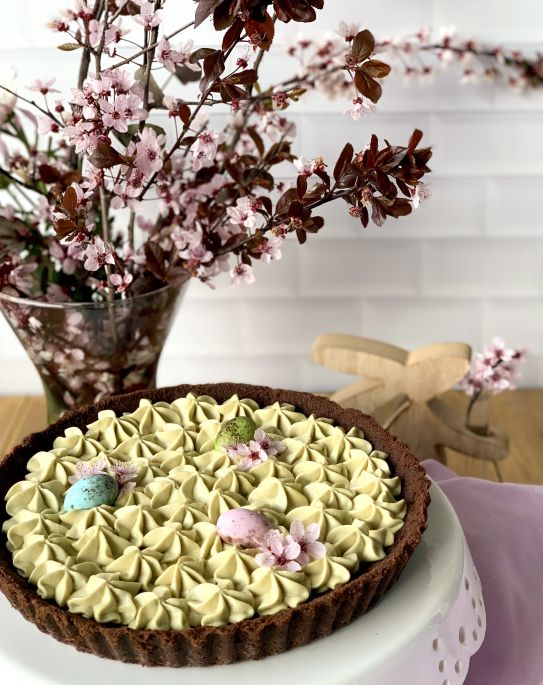 Io amo decorare le torte con i fiori, in questo caso ho utilizzato i fiori di prunus, un delicato rosa che si sposa alla perfezione con il verde del pistacchio e il marrone del cacao