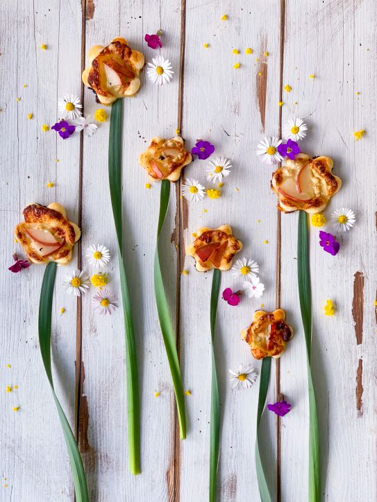 Stendi il rotolo di pasta sfoglia e ricava tanti fiori con un taglia biscotti
