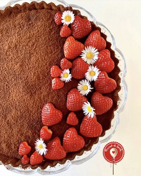 Una volta cotta e raffreddata, metti all’interno la crema pasticcera e decora a piacimento la superficie con una spolverata di cacao amaro in polvere e fragole a forma di cuore