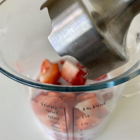 Lava e priva il gambo alle fragole. Tagliale a pezzetti e con un frullatore ad immersione frullale VEDI FOTO