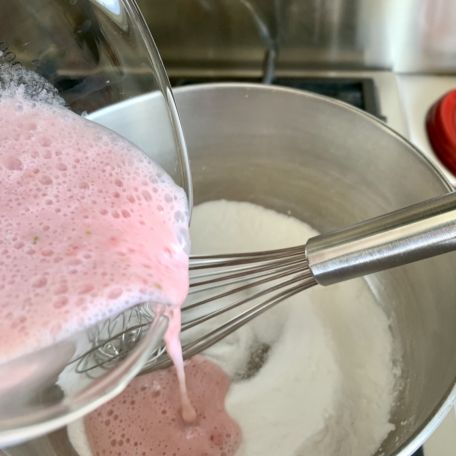In un pentolino, versa la fecola di patate e lo zucchero semolato, mescola i due ingredienti e aggiungi gradatamente le fragole e il latte precedentemente frullate VEDI FOTO