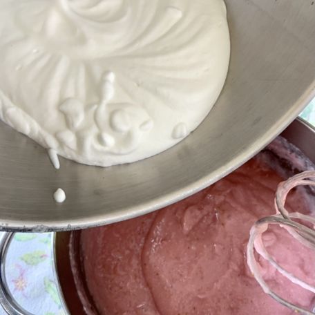 Con le apposite fruste, monta la panna montata con lo zucchero a velo e aggiungila alla crema di fragole, che nel frattempo si sarà raffreddata VEDI FOTO