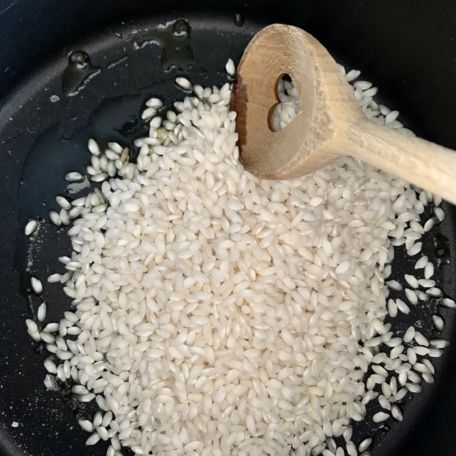 In una casseruola antiaderente metti dell'olio EVO, dei chicchi di sale grosso e fai tostare il riso mescolando delicatamente VEDI FOTO