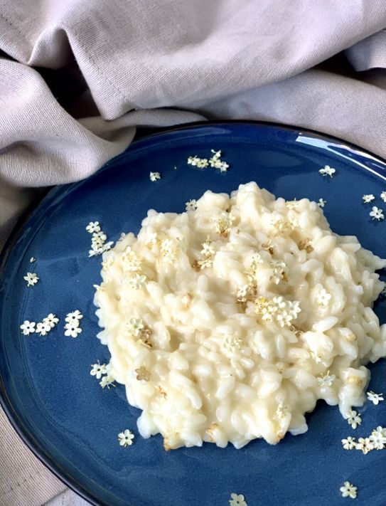 Preleva i piccoli fiori di sambuco dai vari gambi e mettine metà all'interno del risotto e la restante parte, cospargila sui piatti una volta che avrai porzionato il risotto