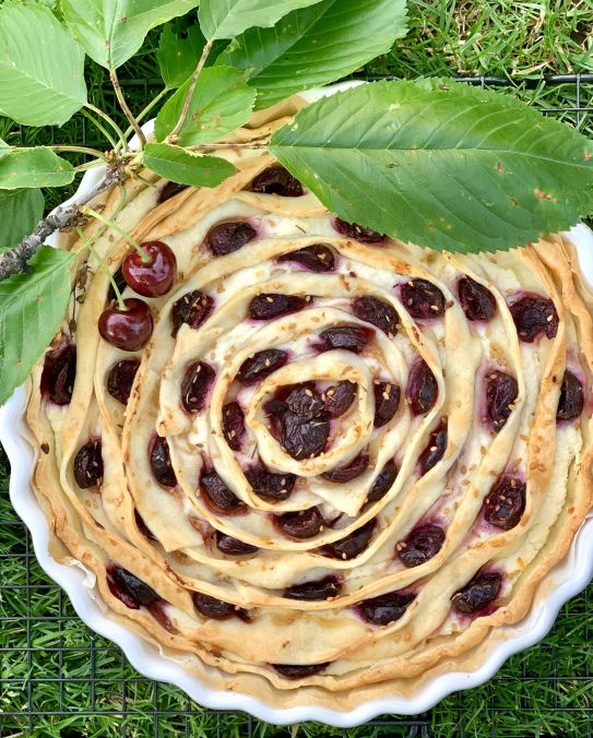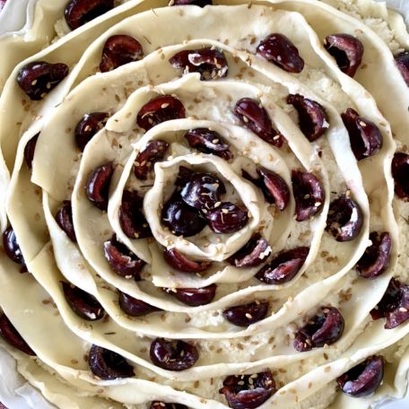 Continua alternando le ciligie con le strisce di pasta brisé fino ad ultimare la spirale