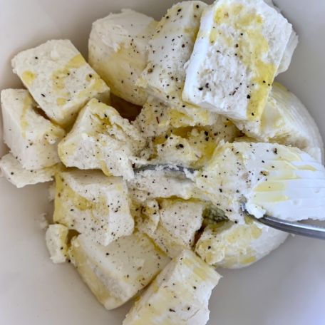 In una ciotola versa la ricotta, i due caprini, olio, sale e pepe a piacimento e mescola fino ad ottenere un composto omogeneo VEDI FOTO