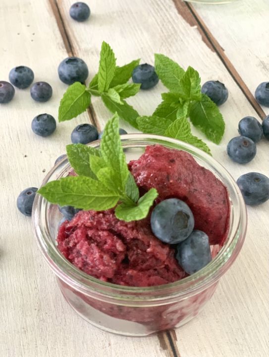A questo punto, con una paletta da gelato, puoi porzionarlo nelle coppette e decorarlo, prima di servirlo, con mirtilli freschi e foglie di menta