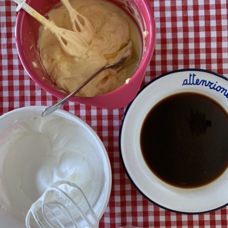 Sbatti i tuorli con lo zucchero fino ad ottenere un impasto gonfio e spumoso, aggiungi poi il mascarpone poco alla volta e continua a sbattere con le fruste elettriche, fino ad ottenere una crema compatta e lascia momentaneamente da parte