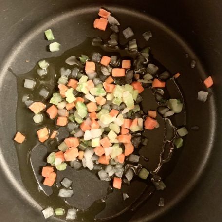 In una casseruola metti dell'olio extra vergine di oliva e il soffiritto (anche in questo caso puoi prendere quello già fatto se non vuoi tagliare le verdure) VEDI FOTO