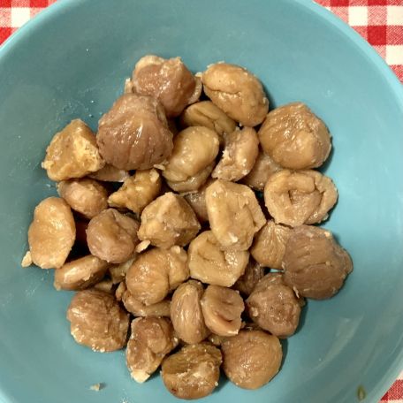Fai lessare le castagne in abbondante acqua per almeno 1 ora, poi sbucciale e lasciale da parte VEDI FOTO