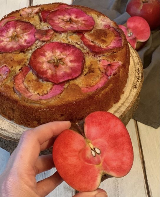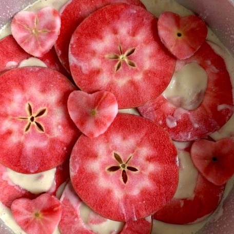 Taglia a fette sottili di circa 2 millimetri la mela rossa mancante, lasciando la buccia e distribuendo i dischi ottenuti sulla superficie della torta VEDI FOTO