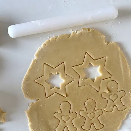 Una volta pronta la frolla, stendila con il mattarello, e con i taglia biscotti a forma di cuore, stella o altri che preferisci, incidi la pasta