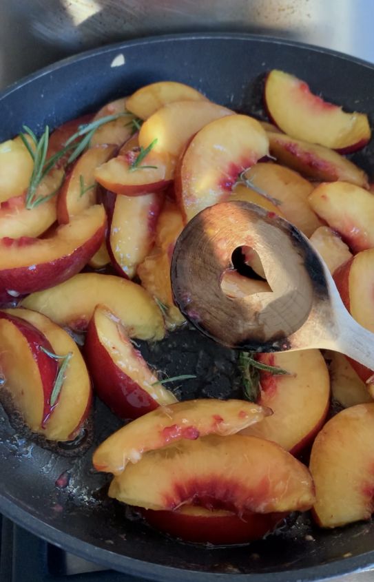 Inizia tagliando le pesche a spicchi e spadellale per circa 5 minuti insieme allo zucchero e ad alcuni rametti di rosmarino