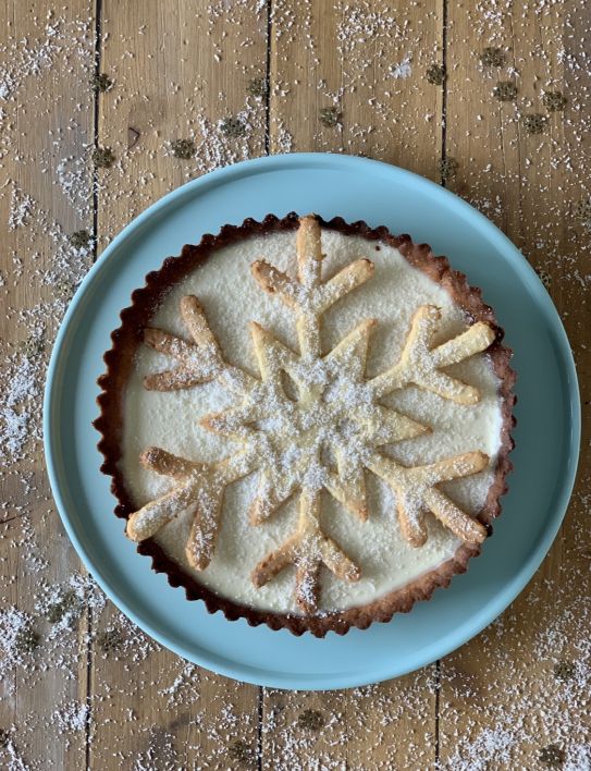 Cerca su internet la sagoma del fiocco di neve che ti piace di più, stampala, ritagliala e posizionala sopra alla frolla stesa con il mattarello