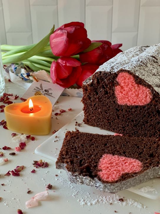 Versa una piccola quantità di impasto al CACAO, appoggia quindi i CUORI ROSSI in fila e ricoprili con tutto il resto dell’impasto