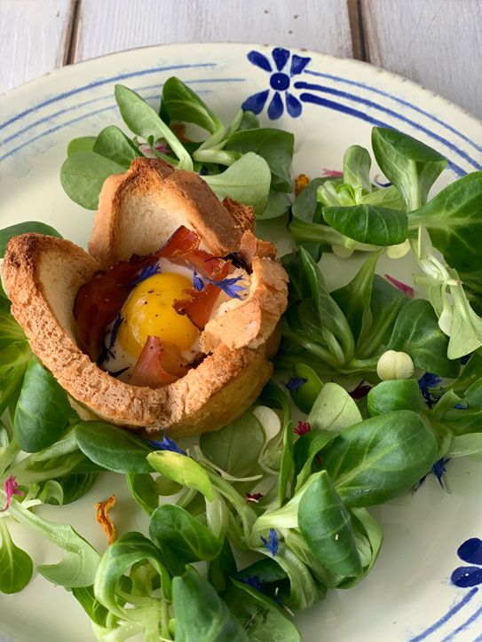 Rivesti il nido con lo speck (una fetta per nido) e rompi un uovo di quaglia direttamente all'interno del nido sopra allo speck