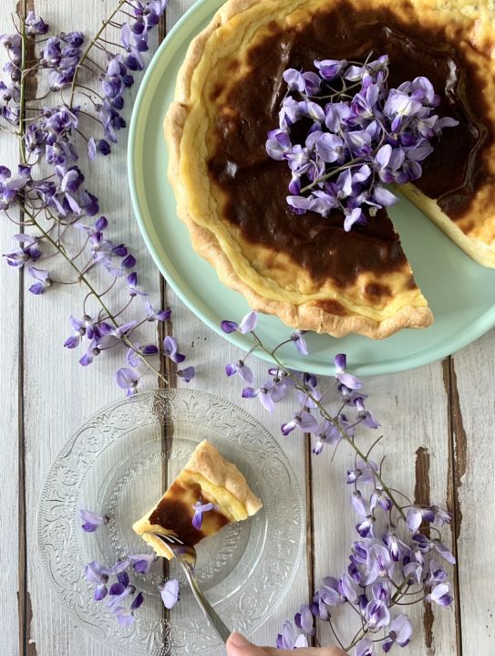 Una volta pronta la crema, stendete il rotolo si pasta sfoglia all'interno di una teglia e praticate dei fori con i rebbi di una forchetta, per evitare che si gonfi in cottura
