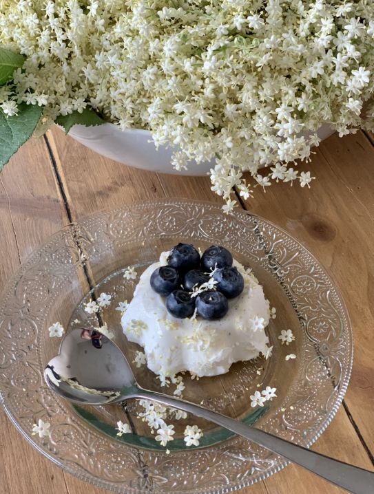 Prendete gli stampi, estraete la panna cotta, decorate con qualche mirtillo e una bella manciata di fiori freschi di sambuco