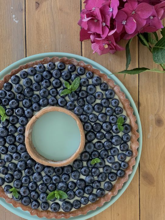 Riempite il guscio di frolla con la crema al limone e disponete i mirtili in modo circolare, partendo dal centro