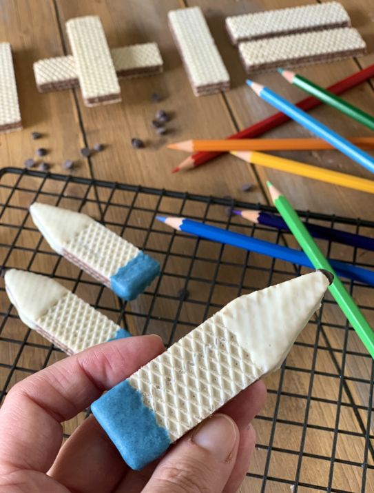 Immergi la base della matita nel cioccolato colorato, scola e lascia riposare su una gratella per dolci, in modo che l'eccesso cada