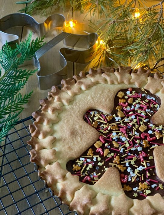 Posiziona il cerchio di frolla con l'omino sopra alla crema alle nocciole e decora con stelle tutto il perimetro