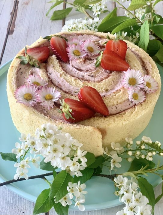 Finito di arrotolare, avrete ottenuto la vostra girella maxi e siete rponti per decorarla con fragole e fiori freschi