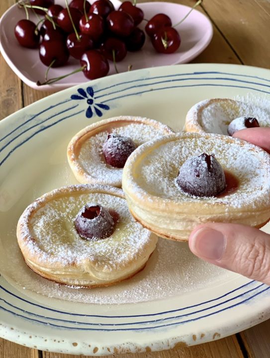 P.S. con i dischi avanzati potete creare dei piccoli cestini mettendo al centro una ciliegia denocciolata e avvolgendo la pasta sfoglia su di essa