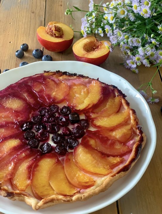 Il vostro 'fiore' di pesche e mirtilli è pronto per essere gustato!