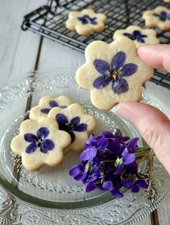 Togliete loro il gambo e sistematele distanziate sulla frolla in modo che ogni violetta sarà al centro del biscotto che andrete a creare