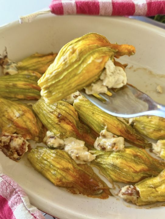 Farcite i fiori di zucca con il composto preparato e disponeteli in una teglia da forno