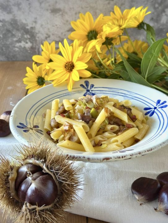 Quando sarà diventato trasparente, aggiungete lo speck a cubetti e le castagne lessate e tagliate in pezzi grossolani