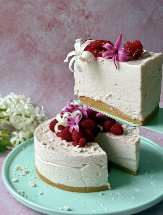 Togliete l'anello della tortiera, il foglio di acetato e decorate con lamponi freschi, meringhe sbriciolate, polvere di lamponi e fiori