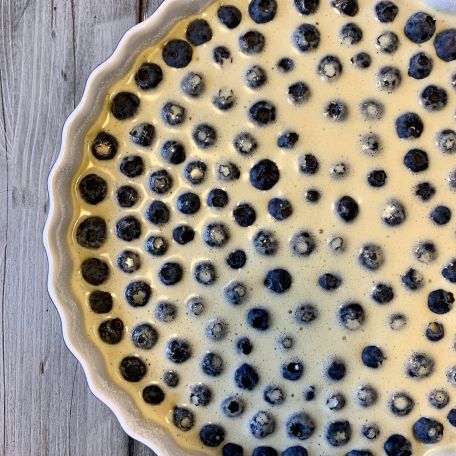 Aggiungere il latte a filo continuando a mecolare e versare la pastella ottenuta (che sarà molto liquida) sui mirtilli all'interno della pirofila come da figura.