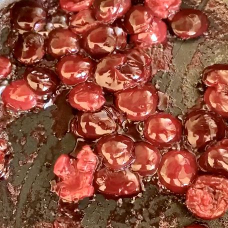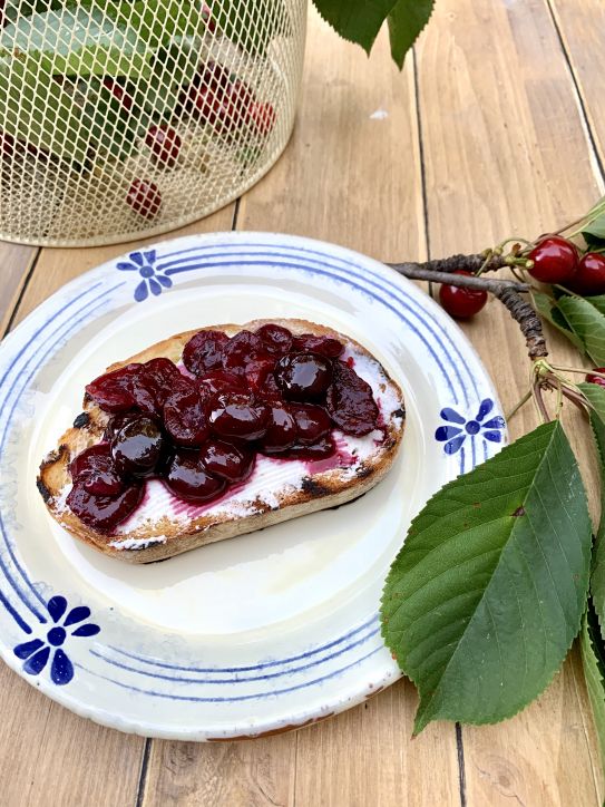 Con un cucchiao disporre sulle fette già spalmate di caprino, le ciliegie ancora calde.