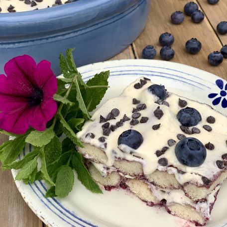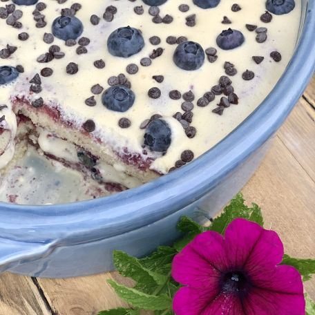 Riprendete il frullato di mirtilli, ormai tiepido, e inzuppate delicatamente i savoiardi per andare a comporre un primo strato del dolce all’interno di uno stampo (vedi la foto), farcite con la crema al mascarpone e mettete parte dei mirtilli che servono per la decorazione e delle gocce di cioccolato fondente.