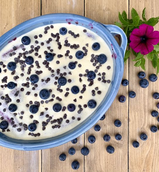 Decorate con i mirtilli freschi restanti e le gocce di cioccolato fondente.