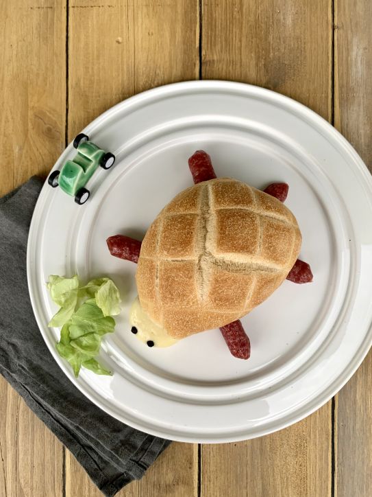 Metti dell'insalata vicino al muso dell'animale e copri con il panino tartaruga che avrai tagliato a metà, questo servirà per formare il guscio!