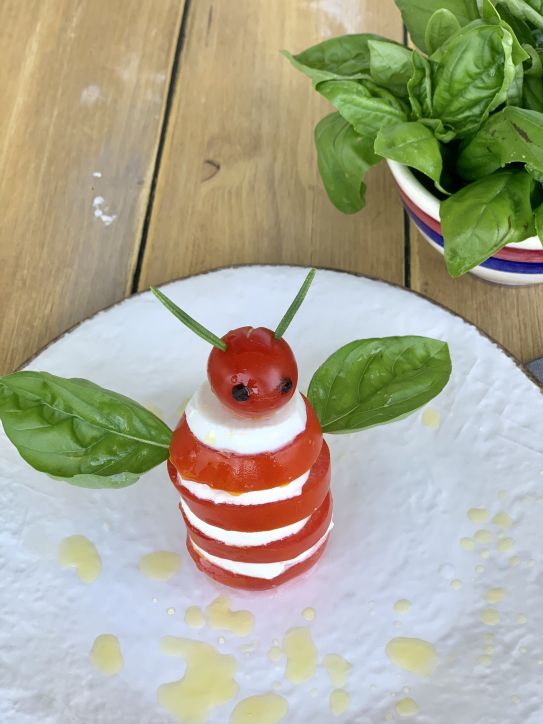 Alterna una fetta di pomodoro con una di mozzarella e termina all'apice con un pomodoro ciliegino per la faccia.