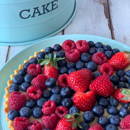 Un guscio di frolla ripieno di crema pasticcera al pistacchio.