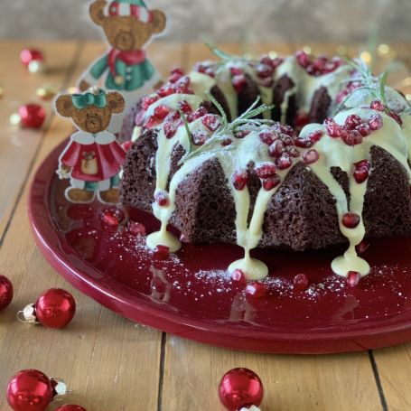Una ciambella super profumata perfetta per le festività natalizie. L'impasto è con farina senza glutine e farina di mandorle. La copertura è con cioccolato bianco, decorato con rametti di rosmarino, chicchi di melagrana e spolverata di zucchero a velo, per renderla ancora più adatta all'inverno