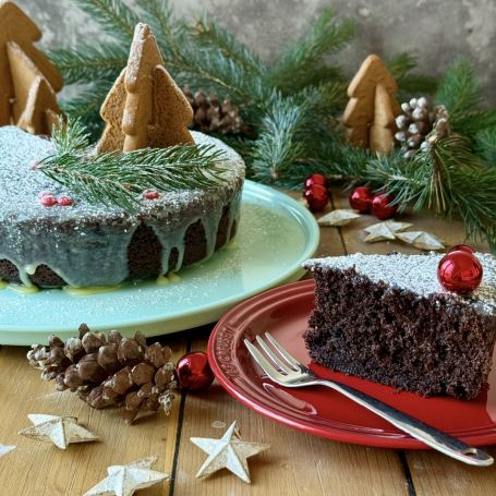 Una torta al cioccolato che sembra uscire dalle fiabe. Soffice impasto al cioccolato, glassa al cioccolato bianco, alberello di pan di zenzero, un rametto di abete e una spolverata di zucchero a velo per simulare la neve